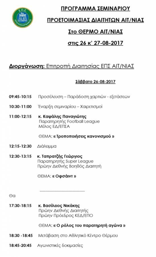 Μεγάλες προσωπικότητες της Ελληνικής διαιτησίας έχουν κληθεί να καταθέσουν τις γνώσεις τους και την συσσωρευμένη εμπειρία ετών -σε ελληνικά και διεθνή γήπεδα- στο σεμινάριο που διοργανώνει η Επιτροπή Διαιτησίας της ΕΠΣ ΑΙΤΩΛΟΑΚΑΡΝΑΝΙΑΣ το διήμερο 26 & 27 Αυγούστου 2017 στην κωμόπολη του Θέρμου.