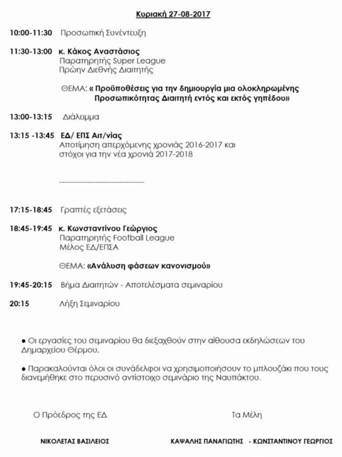 Ανακοινώνεται το πρόγραμμα του ετήσιου σεμιναρίου (26 & 27 Αυγούστου 2017) προετοιμασίας διαιτητών 2017 – 2018 στο ΘΕΡΜΟ: