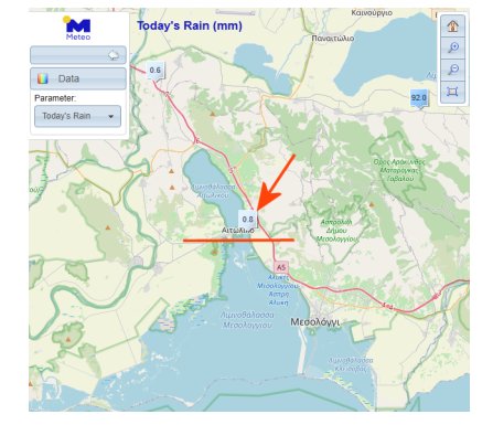 Το ύψος της βροχής δεν είναι γνωστό, διότι έχει χαλάσει το βροχόμετρο (δείχνει μόνο 0.8 mm), κάτι που προφανώς δεν ισχύει.
