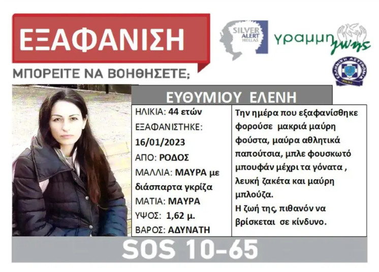 Η Ελένη Ευθυμίου, 44 ετών, την 16 Ιανουαρίου εξαφανίστηκε από το σπίτι της, στη Ρόδο, όταν έφυγε με το αυτοκίνητό της για να μεταφέρει την κόρη της στο σχολείο. Έκτοτε, δεν έχει δώσει σημεία ζωής. Ο σύζυγός της το βράδυ της ίδιας μέρας ενημέρωσε την αστυνομία για την εξαφάνισή της. Λίγες ώρες αργότερα το αυτοκίνητό της, βρέθηκε σε ερημική τοποθεσία, μέσα σε χαντάκι.