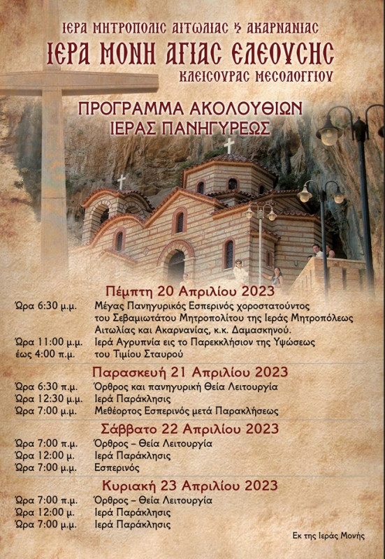 Από την Ιερά Μονή Αγίας Ελεούσης Κλεισούρας Μεσολογγίου ανακοινώνεται ότι, το Πρόγραμμα των Ακολουθιών της Ιεράς Πανηγύρεως από την Πέμπτη 20/4 της Διακαινησίμου εβδομάδος μέχρι και την Κυριακή του Θωμά 23/4, έχει όπως παρακάτω: