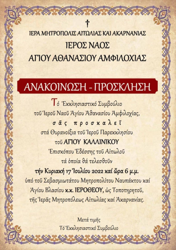 Το εκκλησιαστικό Συμβούλιο του Ιερού Ναού Αγίου Αθανασίου Αμφιλοχίας σας προσκαλεί στα Θυρανοίξια του Ιερού Παρεκκλησίου του Αγίου Καλλινίκου εντός του Αγίου Αθανασίου Επισκόπου Εδέσσης του Αιτωλού τα οποία θα τελεστούν την Κυριακή 17 Ιουλίου 2022 και ώρα 06:00 μ.μ. υπό του Σεβασμιωτάτου Μητροπολίτου Ναυπάκτου και Αγίου Βλασίου κ.κ. Ιερόθεου, ως Τοποτηρητού της Ιεράς Μητροπόλεως Αιτωλίας και Ακαρνανίας.