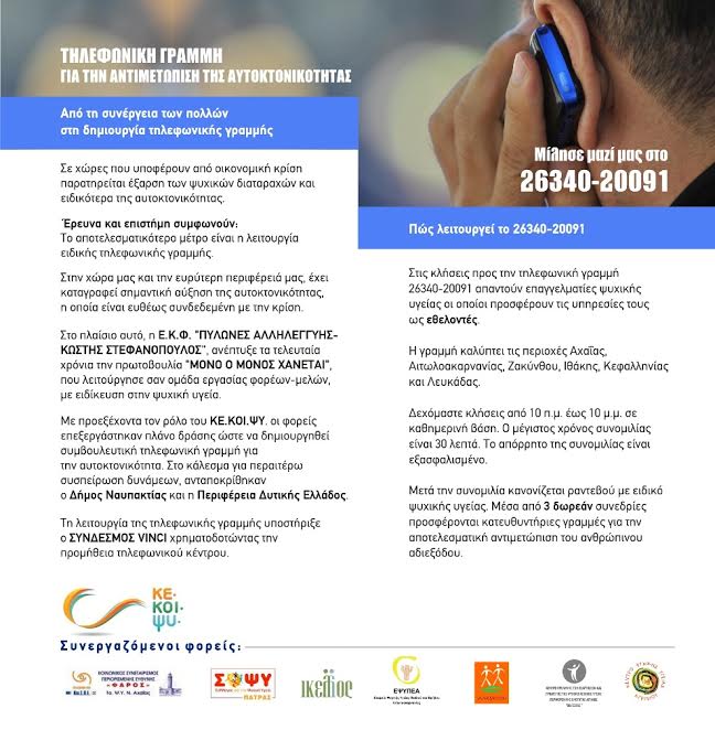 Με προεξάρχοντα τον ρόλο Κέντρου Κοινοτικής Ψυχιατρικής Νοτιοδυτικής Ελλάδας (ΚΕ.ΚΟΙ.ΨΥ), οι φορείς επεξεργάστηκαν πλάνο δράσης ώστε να δημιουργηθεί συμβουλευτική τηλεφωνική γραμμή για την αυτοκτονικότητα.