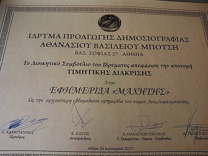 Ειδική τιμητική διάκριση απένειμε το Ίδρυμα Μπότση στην εφημερίδα ΜΑΧΗΤΗΣ , για την προσφορά του στην έγκυρη και ποιοτική ενημέρωση και για τα 56 χρόνια λειτουργίας της ως την αρχαιότερη εφημερίδα του Νομού Αιτωλοακαρνανίας. Το κείμενο της βράβευσης έχει ως εξής: ΕΦΗΜΕΡΊΔΑ ΜΑΧΗΤΉΣ η αρχαιότερη εβδομαδιαία εφημερίδα του νομού Αιτωλοακαρνανιας. Ιδρύθηκε το 1961 από τον αείμνηστο Ανδρέα Κανή και από το 1986 μέχρι και σήμερα συνεχίζει να εκδίδεται από τον υιό του Νικόλαο Κανή . Ο ΜΑΧΗΤΉΣ το 2008 τιμήθηκε με το 1ο Πανελλήνιο Βραβείο Καλύτερου Κυρίου Άρθρου που αθλοθετησε η Γενική Γραμματεία Τύπου και Ενημέρωσης.