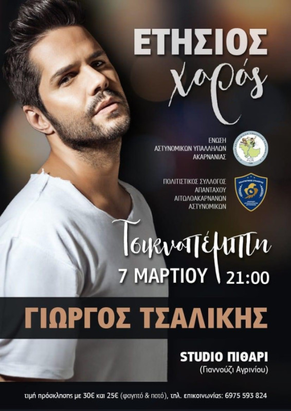 Η Ένωση Αστυνομικών Υπάλληλων Ακαρνανίας και ο Πολιτιστικός Σύλλογος Απανταχού Αιτωλοακαρνάνων Αστυνομικών, πραγματοποιούν τον ετήσιο χορό τους με τον Γιώργο Τσαλίκη.
