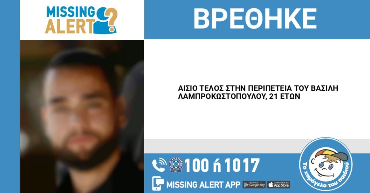 Λίγο πριν τις 10 το πρωί της 28ης Μαρτίου «Το Χαμόγελο του Παιδιού» εξέδωσε ανακοίνωση – Αίσιο τέλος στην περιπέτεια του 21χρονου Καινουργιώτη Βασίλη Λαμπρακωστόπουλου.