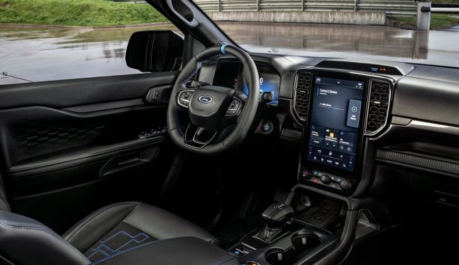 Το σπορ τιμόνι είναι θερμαινόμενο, φέρει μπλε σήμανση για τη θέση της ευθείας και ένθετο με λογότυπο MS-RT. Αποτελώντας το κορυφαίο μοντέλο της σειράς Ranger, το πλήρως συνδεδεμένο επαγγελματικό όχημα είναι επίσης ενσωματωμένο με την πλατφόρμα λογισμικού και συνδεδεμένων υπηρεσιών της Ford Pro, που περιλαμβάνει μεταξύ άλλων ολοκληρωμένες λύσεις φόρτισης για ηλεκτρικά μοντέλα, εργαλεία διαχείρισης από την Ford Pro Telematics και την εφαρμογή FordPass Pro, καθώς και το σύστημα FORDLiive.