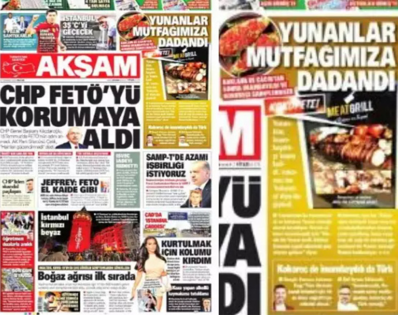 Τα εσωτερικά προβλήματα στην Τουρκία φαίνεται πως έρχονται σε… δεύτερη μοίρα για την εφημερίδα «Aksam», που προτίμησε στο πρωτοσέλιδο της να κατηγορεί την Ελλάδα, αυτή τη φορά για τα… φαγητά!