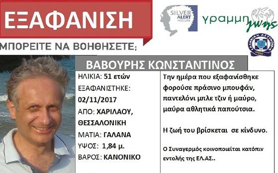 Ο μαθηματικός Κωνσταντίνος Βαβούρης έφυγε την πρώτη Νοεμβρίου από το σπίτι του στην περιοχή Χαριλάου προς άγνωστη κατεύθυνση. Το κινητό του τηλέφωνο και άλλα προσωπικά του αντικείμενα βρέθηκαν στο σπίτι του.