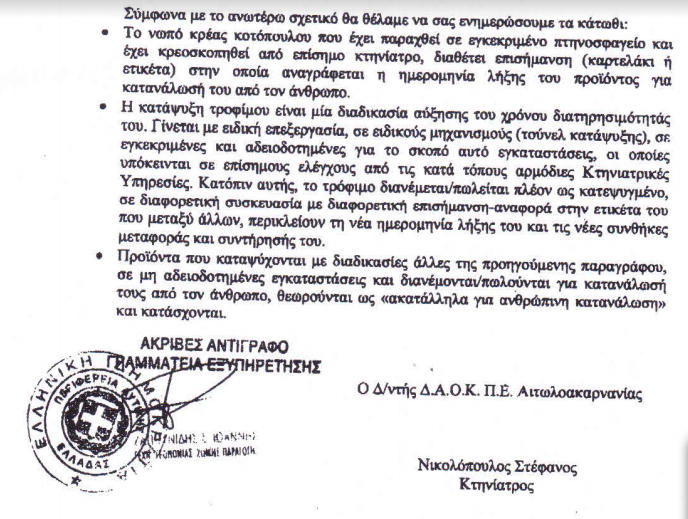 Σχετικά με την καταγγελία που λάβαμε ότι στο Κοινωνικό Παντοπωλείο Αγρινίου διανεμήθηκαν στους δικαιούχους ληγμένα τεμάχια κοτόπουλου (μπούτια) τα οποία είχαν αγορασθεί ως νωπά και έληγαν την 1/11/2017 και ότι τα τεμάχια αυτά λίγο πριν τη λήξη μπήκαν στον καταψύκτη του Κοινωνικού Παντοπωλείου και διανεμήθηκαν στις 7/11/2017 «ως κατεψυγμένα», μετά από εντολή του Ενιαίου Φορέα Ελέγχου Τροφίμων (Ε.Φ.Ε.Τ.), η Δ/νση Αγροτικής Οικονομίας και Κτηνιατρικής της Π.Ε. Αιτ/νιας απάντησε ότι τα κοτόπουλα αυτά ήταν ακατάλληλα για ανθρώπινη κατανάλωση.