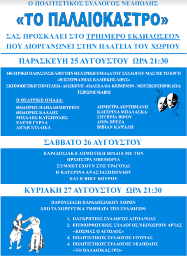 Εκδηλώσεις Τριήμερες πολιτιστικές εκδηλώσεις του Συλλόγου Νεάπολης Αγρινίου «Το Παλαιόκαστρο» 23 Αυγ 2017 AgrinioTimes Share Tweet ☆ Ακολουθήστε μας στο Google News Σχετικά θέματα: Advertisement Τελευταία νέα →22 Οκτ 2025 15:14«Να με λες Μαμά»: Τα δύο τελευταία επεισόδια της σειράς που αγαπήθηκε από το πρώτο κιόλας λεπτό!22 Οκτ 2025 14:05Ντίνα Τσενικλόγλου: Ανείπωτη θλίψη σε Μεσολόγγι και Πρέβεζα για τον πρόωρο θάνατο της 42χρονης22 Οκτ 2025 13:54Αναπηρικά Επιδόματα: Αποφυλακίστηκε η 58χρονη Αγρινιώτισσα φερόμενη αρχηγός, μετά από τέσσερις μήνες22 Οκτ 2025 13:36Αγρίνιο: Γυναίκα δέχθηκε επίθεση από αδέσποτα σκυλιά στη Μαβίλη, της έσκισαν το παντελόνι22 Οκτ 2025 13:26Κωνσταντίνος Καλυβόπουλος: «Έφυγε» σε ηλικία 66 ετών ο Αγρινιώτης Εκπαιδευτικός, την Πέμπτη (23/10) το τελευταίο «αντίο»22 Οκτ 2025 10:58Αγρίνιο – «AGROWN» 2025: Οι Knowledge Partners δίνουν περιεχόμενο, προοπτική και επιστημονικό βάθος στις συζητήσεις22 Οκτ 2025 10:46Περιφέρεια Δυτικής Ελλάδας: Εντατικοποιούνται οι δράσεις καταπολέμησης κουνουπιών μετά τις πρόσφατες βροχοπτώσεις22 Οκτ 2025 10:37Μεσολόγγι: Την Πέμπτη (23/10) τα αποκαλυπτήρια του Ανδριάντα του Χρήστου Καψάλη22 Οκτ 2025 10:15Ημερήσιες Προβλέψεις για τα Ζώδια (22/10)22 Οκτ 2025 10:07Εορτολόγιο: 22 Οκτωβρίου τιμάται από την Εκκλησία ο Όσιος Αβέρκιος