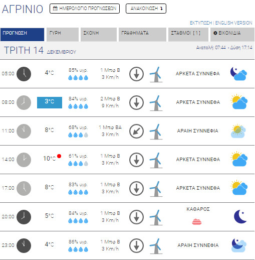 Για την Τρίτη 14 Δεκεμβρίου 2021 προβλέπονται νεφώσεις παροδικά αυξημένες με τοπικές βροχές στα ανατολικά ηπειρωτικά, σποραδικές καταιγίδες στο Αιγαίο και χιονοπτώσεις στα κεντρικά και βόρεια ορεινά και πρόσκαιρα στα βόρεια και κυρίως βορειοανατολικά ημιορεινά τμήματα.