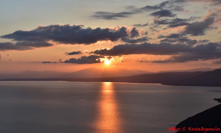 Ο ήλιος καρφιτσωμένος στον ουρανό, μετρώντας αντίστροφα τα λεπτά μέχρι ν’ αγγίξει το νερό της λίμνης και να κρυφτεί πίσω απ’ τη γραμμή του ορίζοντα, να περάσει την κορυφογραμμή του Αρακυνθου, ένας δραπέτης του κόσμου με το κύκνειο άσμα του. Κι αμέσως το γαλάζιο της λίμνης άλλαξε χρωματισμό και ντύθηκε στα χρώματα του ουρανού, που αυτή την ώρα απαρτιζόταν από ποικίλες αποχρώσεις του πορτοκαλί και του γκρι, ενώ και τα βουνά τριγύρω πήραν μια μαγευτική γκριζωπή απόχρωση.