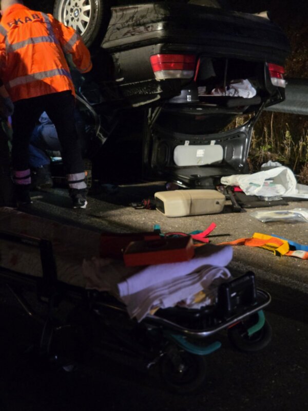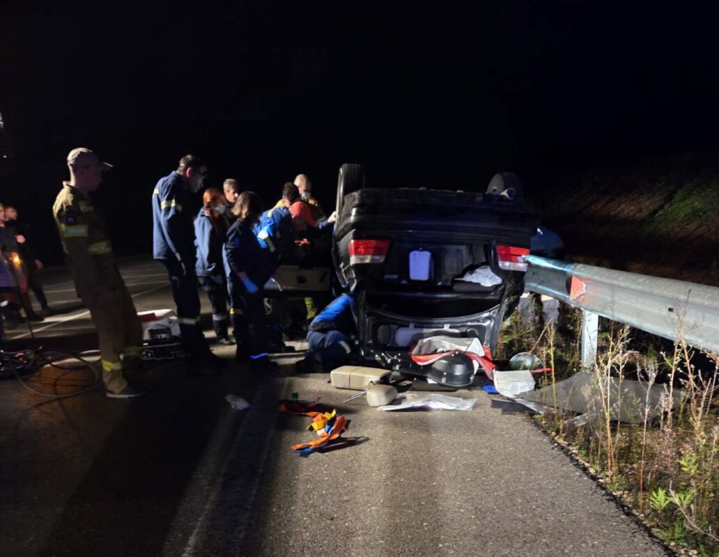Οι τρεις επιβάτες του ενός οχήματος δείχνουν να είναι καλά στην υγεία τους ενώ η Πυροσβεστική προσπαθεί να απεγκλωβίσει τους άλλους δύο από το όχημα που έχει ανατραπεί.