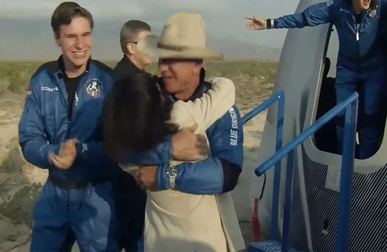 Φορώντας καπέλο καουμπόι, ο Τζεφ Μπέζος αγκάλιασε την 82χρονη, που ήταν και το τιμώμενο πρόσωπο της αποστολής. Ο Όλιβερ Ντέμεν ήταν ο μόνος από τους τέσσερις αστροναύτες που αγόρασε εισιτήριο για να επιβιβαστεί. Ο ενθουσιασμός του ήταν μεγάλος. Για να γιορτάσουν την επιτυχία τους, οι τέσσερις αστροναύτες ήπαν σαμπάνια, κάτι που έκανε και ο δισεκατομμυριούχος Σερ Ρίτσαρντ Μπράνσον, που πριν λίγες ημέρες έκοψε πρώτος το νήμα για τις πτήσεις στο διάστημα.