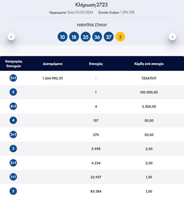 €1.500.000 τουλάχιστον θα μοιραστούν οι τυχεροί της 1ης κατηγορίας στην επόμενη κλήρωση της Πέμπτης, 7 Μαρτίου 2024 μετά το Τζακ-Ποτ που σημειώθηκε κατά τη διαλογή της 2723ης κλήρωσης του Τζόκερ.