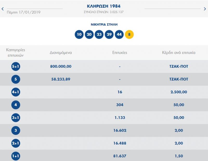 €1.100.000 τουλάχιστον θα μοιραστούν οι τυχεροί της 1ης κατηγορίας στην επόμενη κλήρωση της ΚΥΡΙΑΚΗΣ 20/01/2019 μετά το ΤΖΑΚ-ΠΟΤ που σημειώθηκε κατά τη σημερινή διαλογή της 1984ης κλήρωσης του ΤΖΟΚΕΡ.