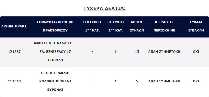 Άλλο ένα Τζακ-Ποτ στην πρώτη κατηγορία του Τζόκερ τη στιγμή που στην αμέσως επόμενη είχαμε δύο νικητές από Τρίπολη και Βύρωνα που κέρδισαν από 100 χιλιάδες ευρώ ο καθένας