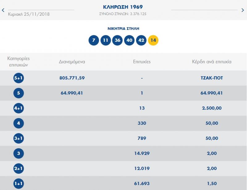 €1.200.000 τουλάχιστον θα μοιραστούν οι τυχεροί της 1ης κατηγορίας στην επόμενη κλήρωση της ΠΕΜΠΤΗΣ 29/11/2018 μετά το ΤΖΑΚ-ΠΟΤ που σημειώθηκε κατά τη σημερινή διαλογή της 1969ης κλήρωσης του ΤΖΟΚΕΡ.