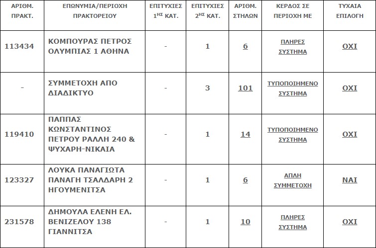 Επίσης στην δεύτερη κατηγορία (5άρια) βρέθηκαν εφτά (7) επιτυχίες, τα οποία κερδίζουν το ποσό των €12.557,77 έκαστη.