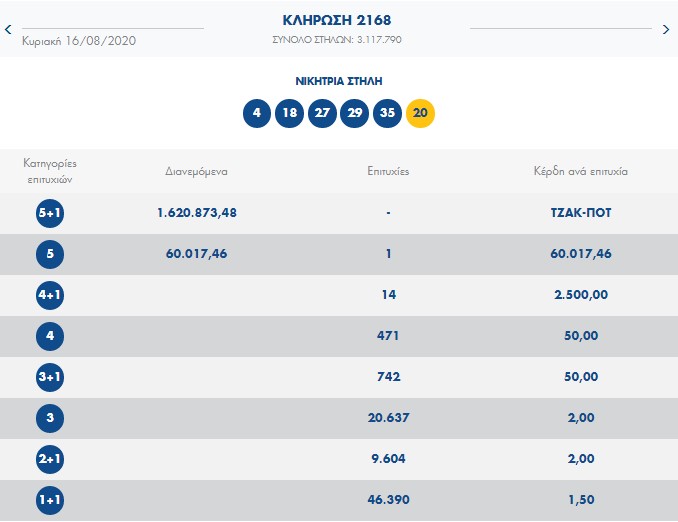 €1.800.000 τουλάχιστον θα μοιραστούν οι τυχεροί της 1ης κατηγορίας στην επόμενη κλήρωση της Τρίτης 18/8/2020 μετά το τζακ-ποτ που σημειώθηκε κατά τη σημερινή διαλογή της 2168ης κλήρωσης του Τζόκερ.