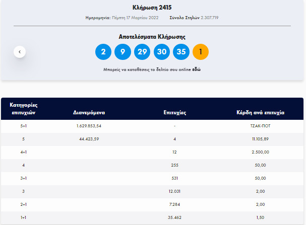 Τουλάχιστον 2.000.000 € θα μοιραστούν στους τυχερούς της 1ης βαθμίδας βραβείων στην επόμενη κλήρωση της Κυριακής, 20 /3/2022 μετά το Τζακ-Ποτ που έγινε κατά τη διαλογή της σημερινής 2415ης κλήρωσης Τζόκερ.