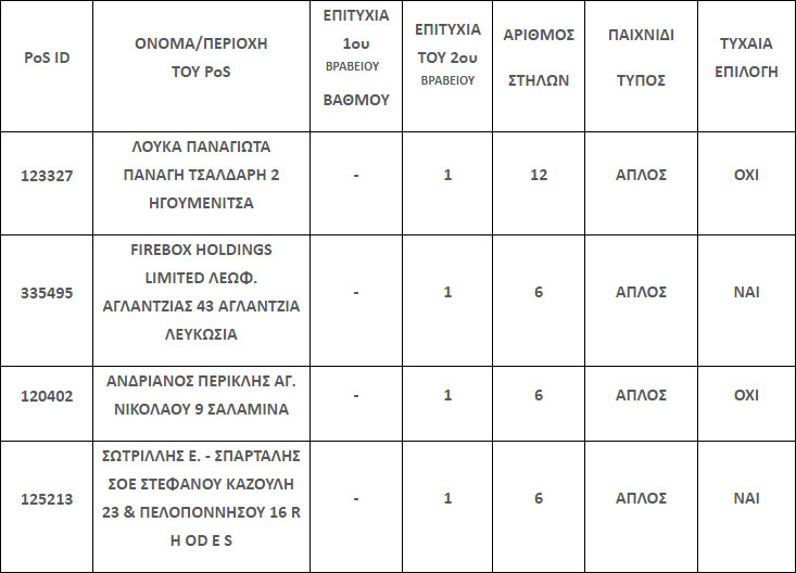 Επίσης τέσσερις (4) επιτυχίες ταίριαξαν με το 2ο βραβείο (5) και κέρδισαν το ποσό των €11.105,89 έκαστη.