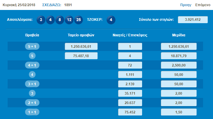 Ένα (1) τυχερό λαχείο ταιριάζει το 1 ου βραβείου βαθμίδα (5 + 1) κατά τη διαλογή της σημερινής 1891ο ΤΖΟΚΕΡ κλήρωση που κερδίζει το ποσό των € 1.250 .636,61 .