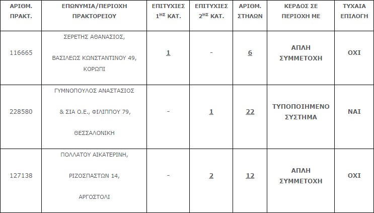 Επίσης, τέσσερα (4) τυχερά δελτία βρέθηκαν στην 2η κατηγορία (5), εκ των οποίων το ένα φέρει 2 επιτυχίες και τα οποία κερδίζουν το ποσό των € 31.879,96 για κάθε επιτυχία.
