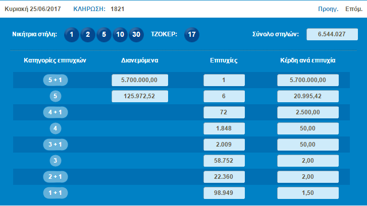 Ένα (1)τυχερό δελτίο βρέθηκε στην 1η κατηγορία (5+1) κατά τη σημερινή διαλογή της 1821ης κλήρωσης του ΤΖΟΚΕΡ που κερδίζει το ποσό των € 5.700.000.