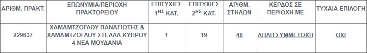 Ένα (1)τυχερό δελτίο βρέθηκε στην 1η κατηγορία (5+1) κατά τη σημερινή διαλογή της 1843ης κλήρωσης του ΤΖΟΚΕΡ που κερδίζει το ποσό των € 6.352.421,51 και το οποίο φέρει και δεκαννέα (19) επιτυχίες στη δεύτερη κατηγορία (5) όπου η κάθε επιτυχία κερδίζει από €6.331,39.