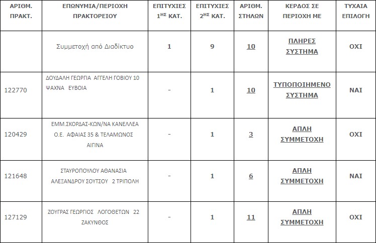 Επίσης, τέσσερα (4) τυχερά δελτία βρέθηκαν στην 2η κατηγορία (5), τα οποία κερδίζουν το ποσό των € 14.368,04 έκαστο.