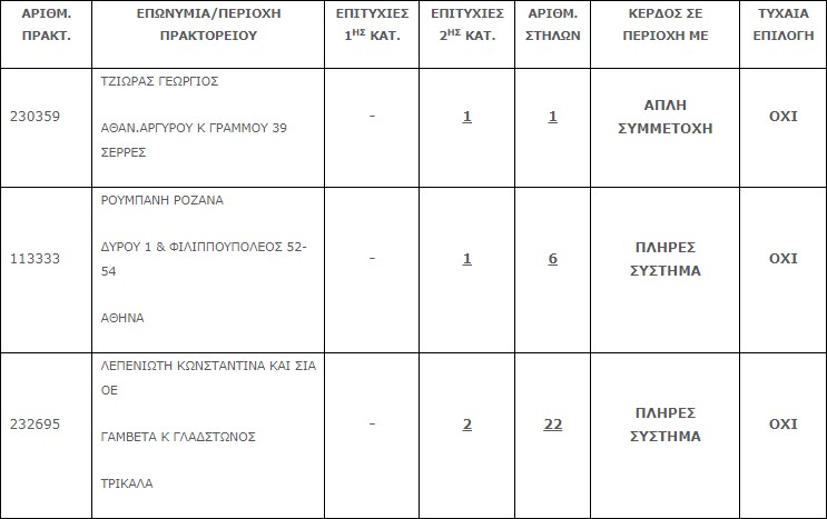 Επίσης στην δεύτερη κατηγορία (5άρια) βρέθηκαν έξι (6) τυχερά δελτία, εκ των οποίων το ένα φέρει δύο (2) επιτυχίες και τα οποία κερδίζουν το ποσό των €11.454,79 για κάθε επιτυχία.
