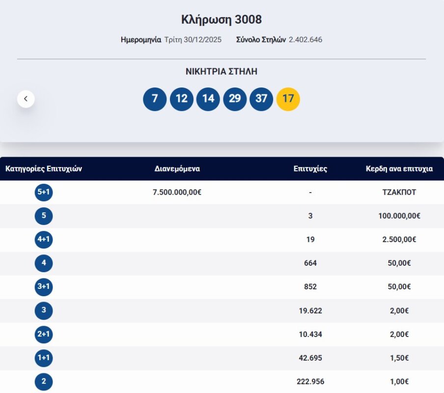 €7.800.000 τουλάχιστον θα μοιραστούν οι τυχεροί της 1ης κατηγορίας στην επόμενη κλήρωση της Πέμπτης, 1 Ιανουαρίου 2026 μετά το ΤΖΑΚ-ΠΟΤ που σημειώθηκε κατά τη διαλογή της 3008ης κλήρωσης του Τζόκερ.