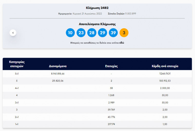 Τουλάχιστον 10.000.000 € θα μοιραστούν στους τυχερούς της 1ης βαθμίδας βραβείων στην επόμενη κλήρωση της Τρίτης 23 /8/2022 μετά το Τζακ-Ποτ που έγινε κατά τη διαλογή της σημερινής 2482ης κλήρωσης Τζόκερ.