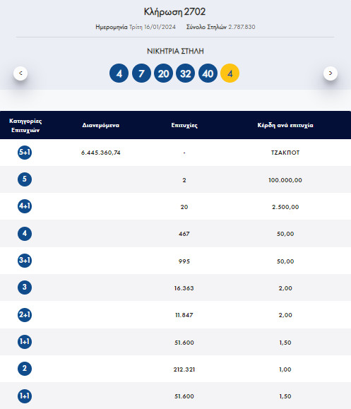 €7.000.000 τουλάχιστον θα μοιραστούν οι τυχεροί της 1ης κατηγορίας στην επόμενη κλήρωση της Πέμπτης, 18 Ιανουαρίου 2024 μετά το Τζακ-Ποτ που σημειώθηκε κατά τη διαλογή της 2702ης κλήρωσης του Τζόκερ.