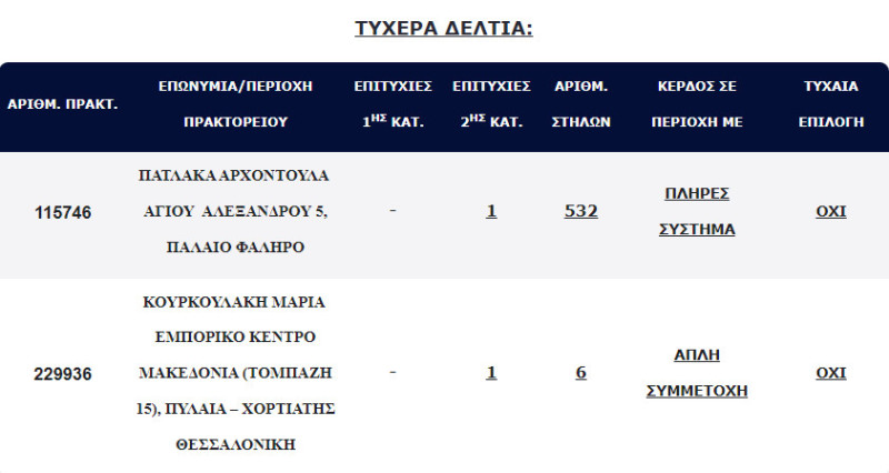 Επίσης, στη δεύτερη κατηγορία (5άρια) βρέθηκάν δύο (2) τυχερά δελτία, τα οποία κερδίζουν το ποσό των €100.000,00.