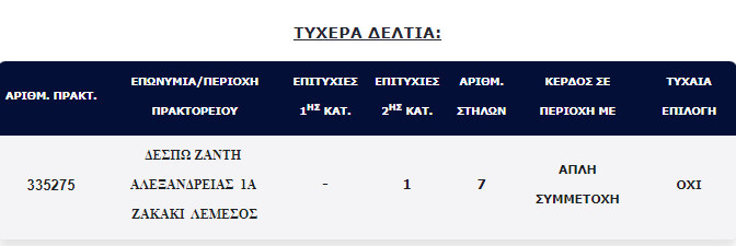 Επίσης, στην δεύτερη κατηγορία (5άρια) βρέθηκε ένα (1) τυχερό δελτίο, το οποίο κερδίζει το ποσό των €100.000,00.