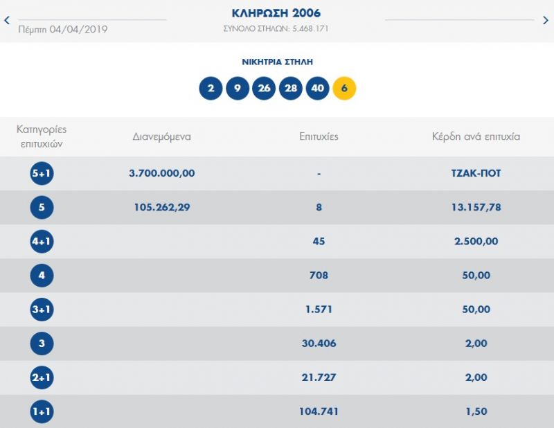 €4.400.000 τουλάχιστον θα μοιραστούν οι τυχεροί της 1ης κατηγορίας στην επόμενη κλήρωση της ΚΥΡΙΑΚΗΣ 7/4/2019 μετά το ΤΖΑΚ-ΠΟΤ που σημειώθηκε κατά τη σημερινή διαλογή της 2006ης κλήρωσης του ΤΖΟΚΕΡ.