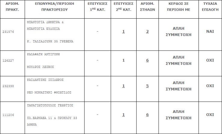 Επίσης στην δεύτερη κατηγορία (5άρια) βρέθηκαν οχτώ (8) επιτυχίες . Η κάθε επιτυχία κερδίζει το ποσό των € 16.582,31.