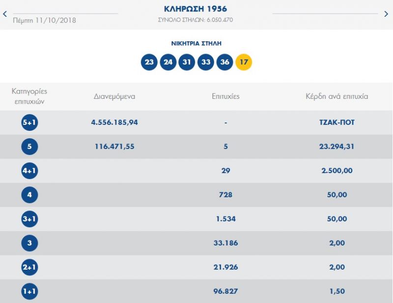 €5.400.000 τουλάχιστον θα μοιραστούν οι τυχεροί της 1ης κατηγορίας στην επόμενη κλήρωση της ΚΥΡΙΑΚΗΣ 14/10/2018 μετά το ΤΖΑΚ-ΠΟΤ που σημειώθηκε κατά τη σημερινή διαλογή της 1956ης κλήρωσης του ΤΖΟΚΕΡ.