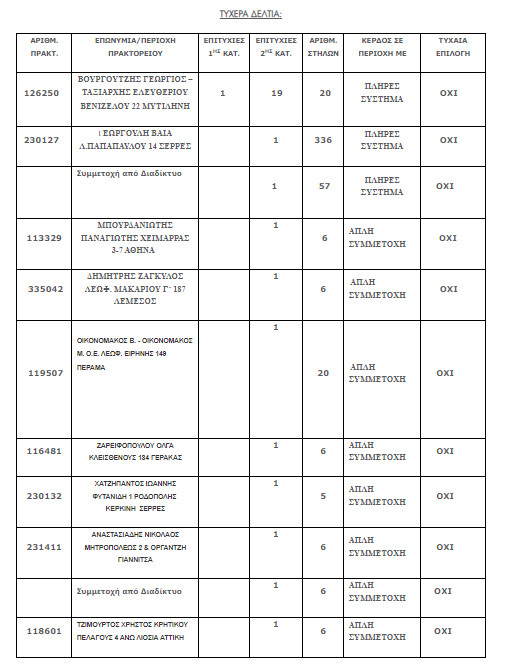 Επίσης, δέκα (10) τυχερά δελτία βρέθηκαν στην 2η κατηγορία (5) τα οποία κερδίζουν το ποσό των €6.666,38για κάθε επιτυχία.