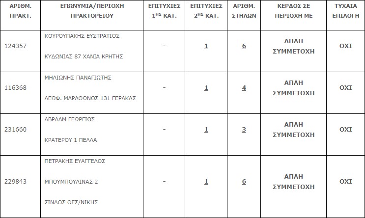 Επίσης στην δεύτερη κατηγορία (5άρια) βρέθηκαν τέσσερα (4) τυχερά δελτία, τα οποία κερδίζουν το ποσό των €27.241,95 έκαστο.