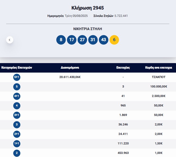 Χθες, μόλις τρεις τυχεροί (μπορεί και άτυχοι) κέρδισαν από 100.000 ευρώ όμως κανείς δε έγινει εκατομμυριούχος και το Τζακ-Ποτ ξεπέρασε τα 20,4 και έφτασε τα 22 εκατομμύρια ευρώ!