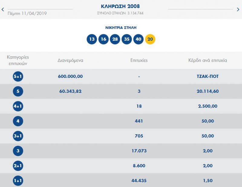 € 700.000 τουλάχιστον θα μοιραστούν οι τυχεροί της 1ης κατηγορίας στην επόμενη κλήρωση της KYΡΙΑΚΗΣ 14/04/2019 μετά το ΤΖΑΚ-ΠΟΤ που σημειώθηκε κατά τη σημερινή διαλογή της 2008ς κλήρωσης του ΤΖΟΚΕΡ.
