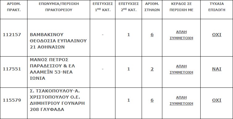 Επίσης στην δεύτερη κατηγορία (5άρια) βρέθηκαν τρία (3) τυχερά δελτία, τα οποία κερδίζουν το ποσό των €23.977,84 έκαστο.
