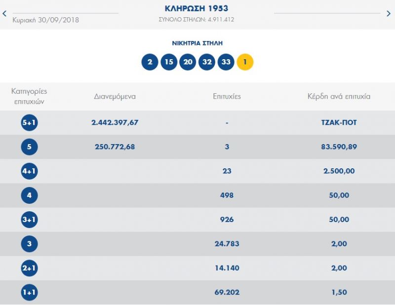 € 3.000.000 τουλάχιστον θα μοιραστούν οι τυχεροί της 1ης κατηγορίας στην επόμενη κλήρωση της ΠΕΜΠΤΗΣ 04/10/2018 μετά το ΤΖΑΚ-ΠΟΤ που σημειώθηκε κατά τη σημερινή διαλογή της 1953ης κλήρωσης του ΤΖΟΚΕΡ.