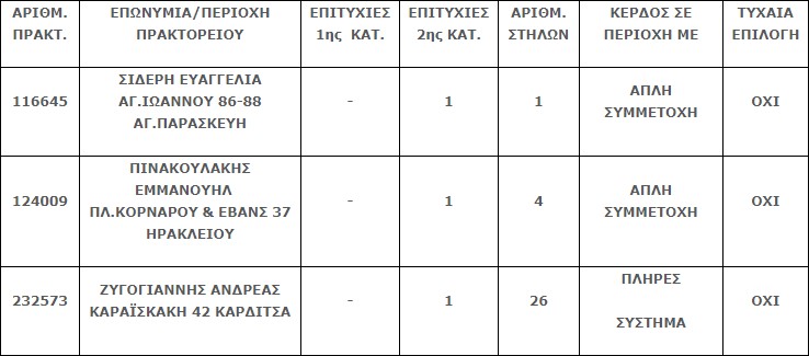 Επίσης στην δεύτερη κατηγορία (5άρια) βρέθηκαν τρία (3) τυχερά δελτία που το καθένα κερδίζει το ποσό των € 83.590,89.