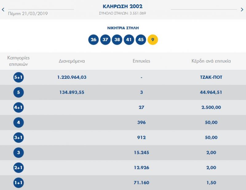 €1.700.000 τουλάχιστον θα μοιραστούν οι τυχεροί της 1ης κατηγορίας στην επόμενη κλήρωση της ΚΥΡΙΑΚΗΣ 24/03/2019 μετά το ΤΖΑΚ-ΠΟΤ που σημειώθηκε κατά τη σημερινή διαλογή της 2002ης κλήρωσης του ΤΖΟΚΕΡ.