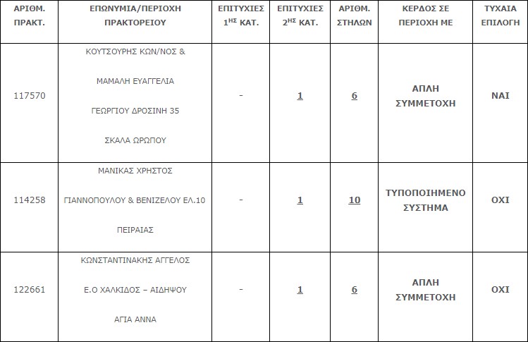 Επίσης στην δεύτερη κατηγορία (5άρια) βρέθηκαν τρεις (3) επιτυχίες, οι οποίες κερδίζουν το ποσό των €44.964,51 έκαστη.